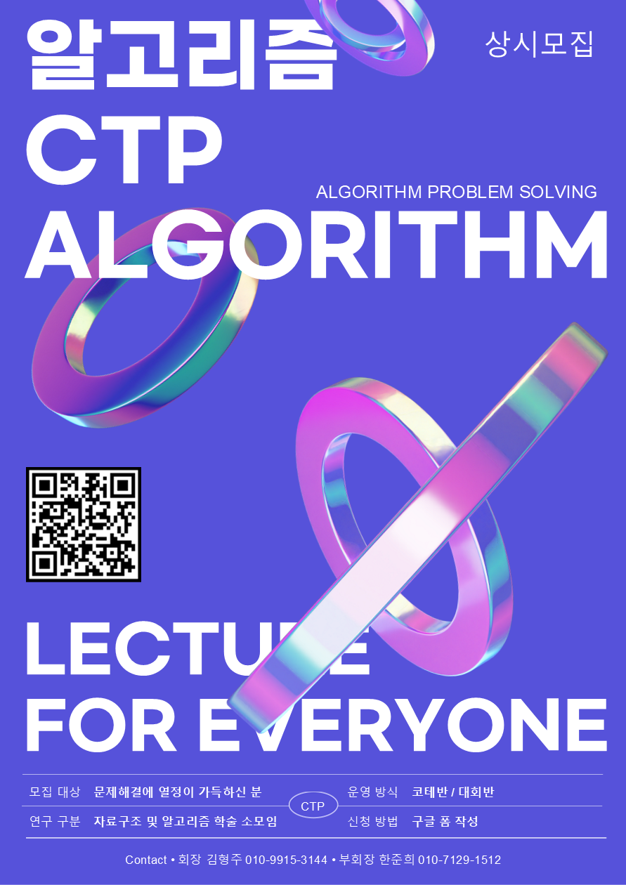 CTP(Challenge The Programming)는 자료구조 및 다양한 알고리즘을 학습, 연구하거나 여러 프로그래밍 대회를 준비하는 학술 소모임입니다.